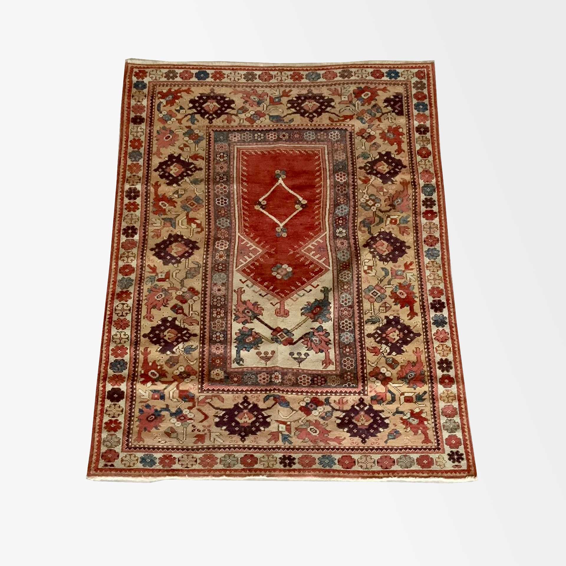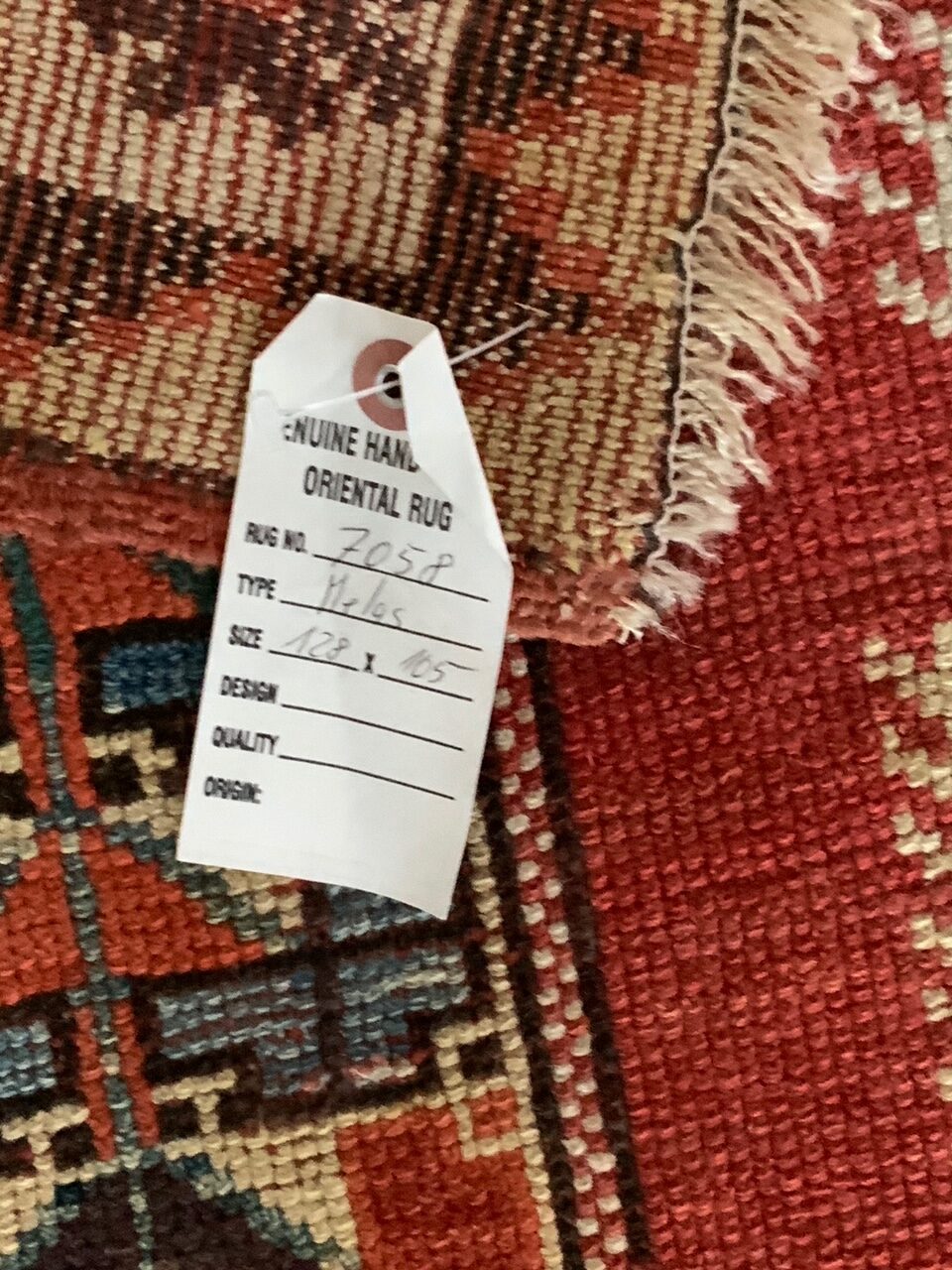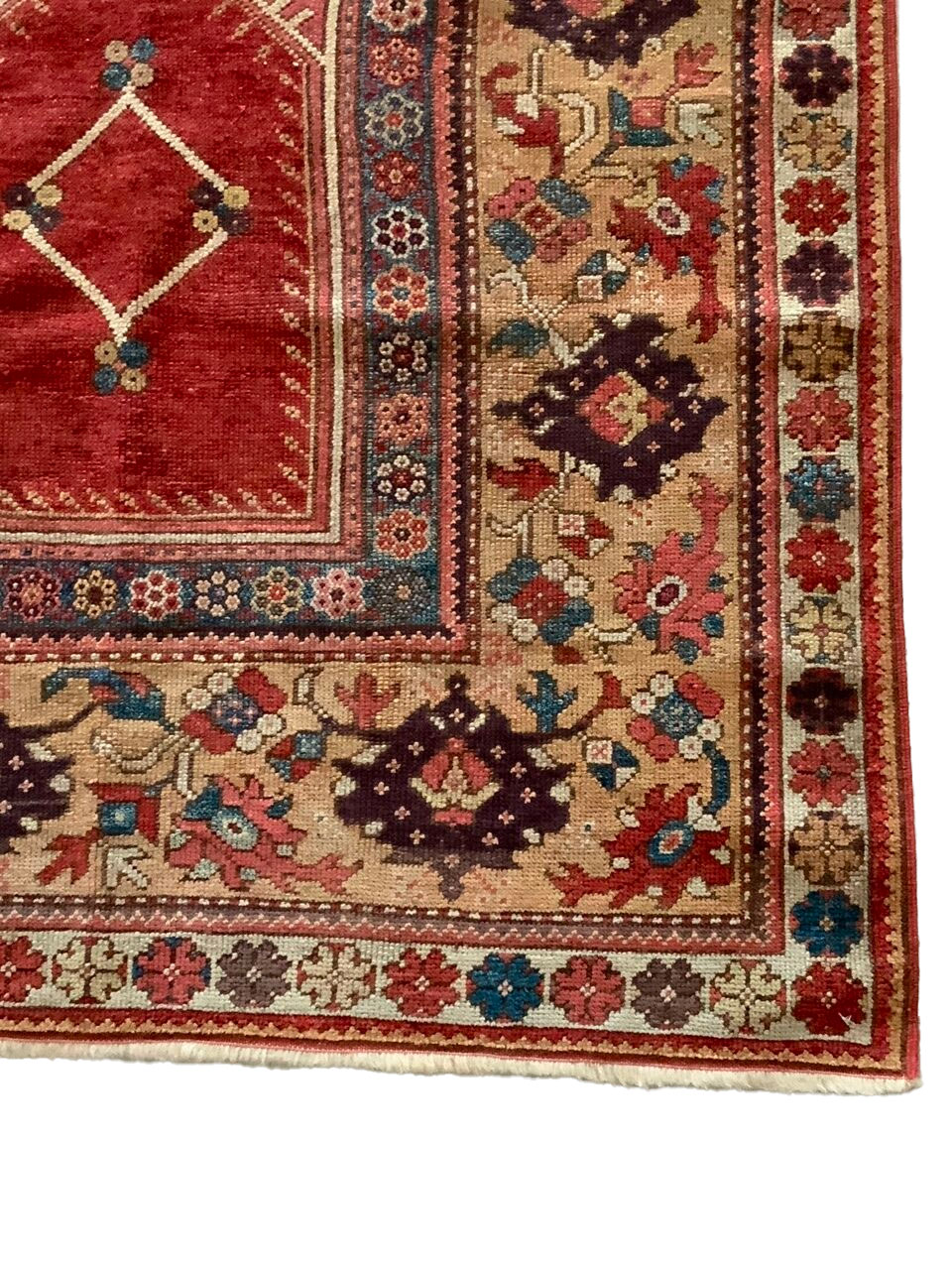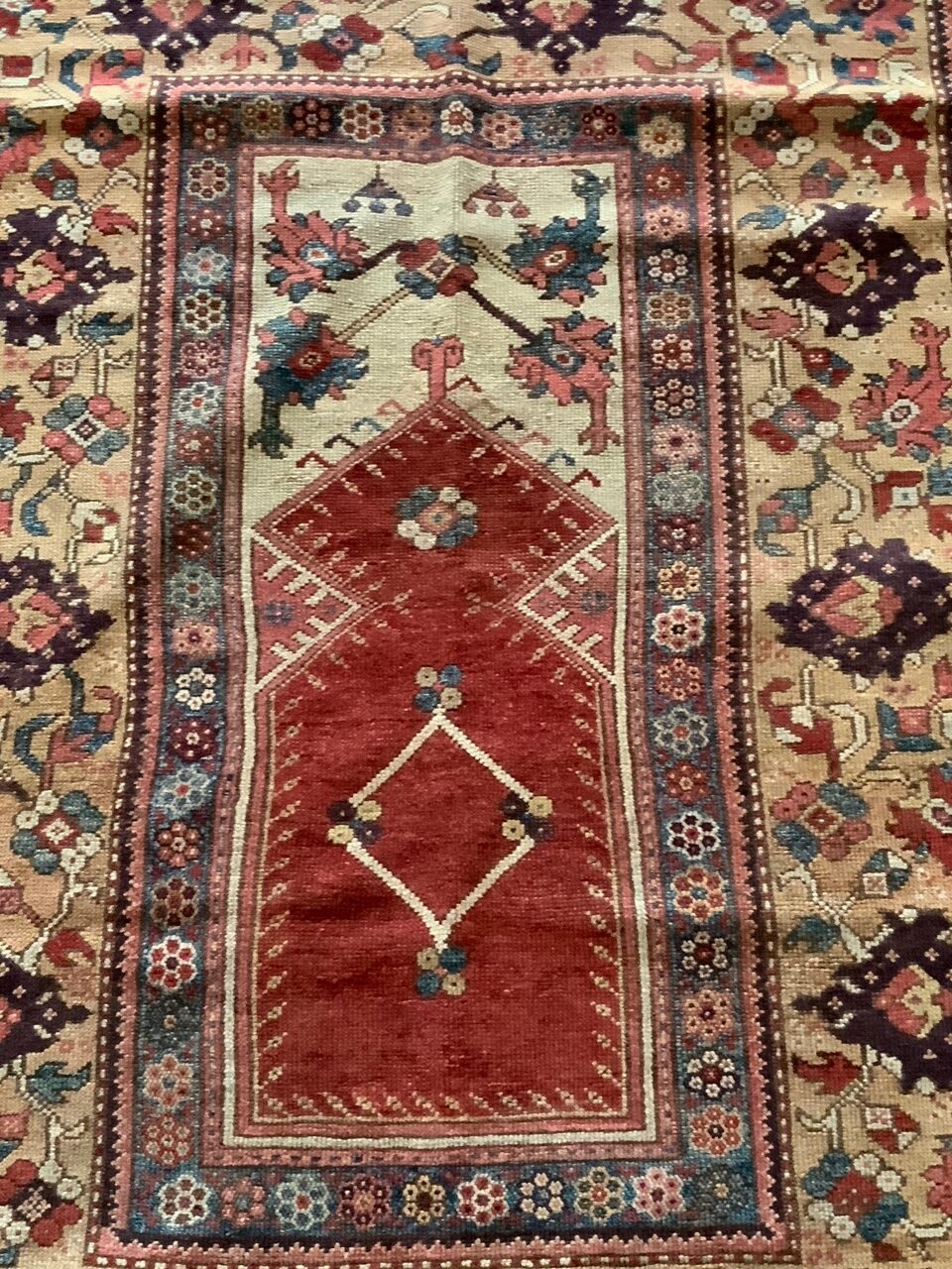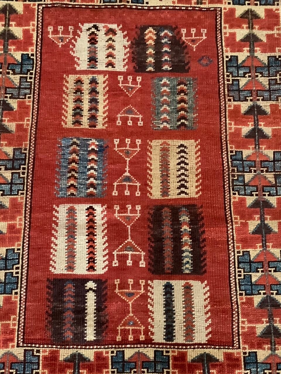 L’annodatore, all’atto di inserire la trama tra una fila di nodi e l’altra, ha deciso di cambiare il colore e formare così una Mirhab (una preghiera) al loro interno. In questo modo anche un semplice annodatore di tappeti poteva celare dietro le trame dei tessuti messaggi profondi di carattere religioso, che in questo caso si ripetono per due volte: la prima volta in modo palese e leggibile dalla parte del vello, e la seconda nascosta all’interno della struttura stessa del tappeto.